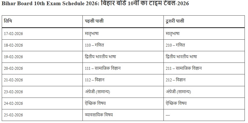 Bihar Board 10th Exam Schedule 2026: बिहार बोर्ड 10वीं का टाइम टेबल-2026