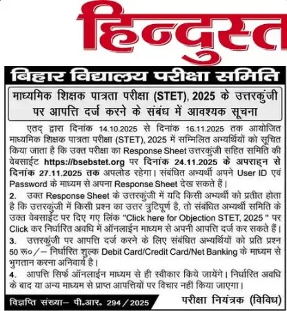 BSEB ने 23 नवंबर 2025 को Newspaper नोटिस जारी कर बताया कि सभी उम्मीदवार 24 नवंबर 2025 दोपहर के बाद से अपने Answer Key और Response Sheet चेक कर सकेंगे।
